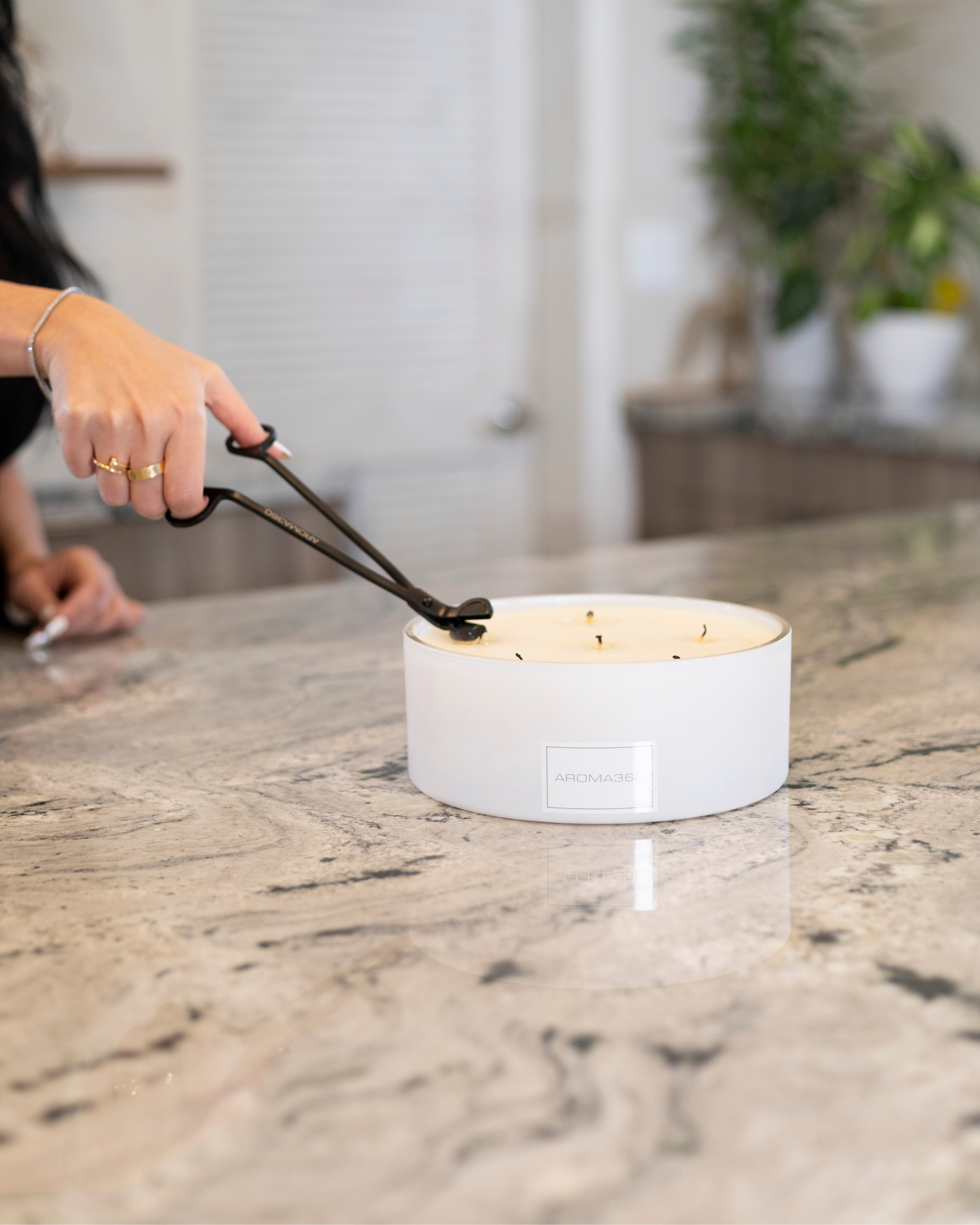 Extend the life of your candle with properly trimmed wicks. This scissor-like device will clip the excess ashy wick, ensuring your candle will burn more cleanly, and evenly. Produced with reinforced metal these smooth matte black wick trimmers are the perfect companion piece to your Aroma360 candle.